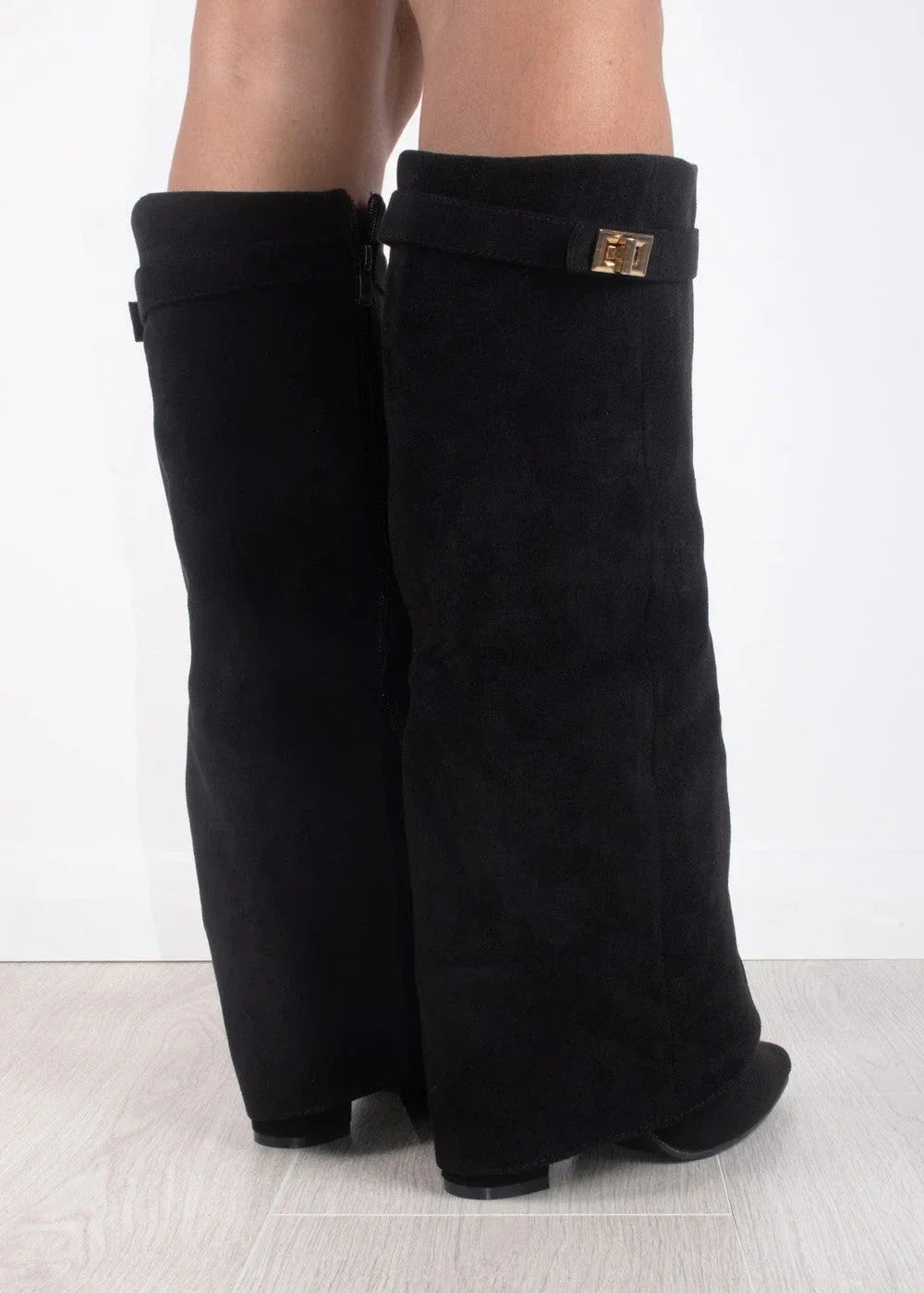 Elevate your look with the Faux Suede Foldover Boots—crafted in luxe suede-finish fabric with a sleek foldover design, pointed toe, and mid-height heel. The perfect finishing touch to effortlessly elevate any outfit.